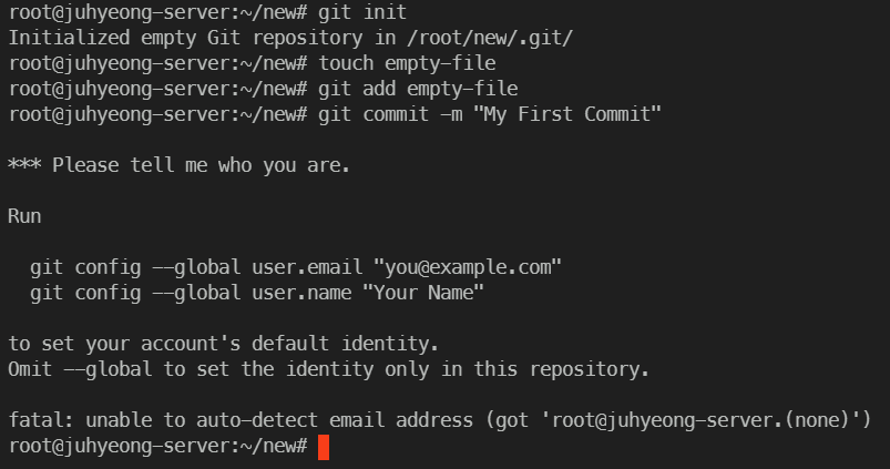 "**** Please tell me who you are.**"라는 문구가 출력되면서 Commit에 실패합니다. Commit을 만들기 위해 필요한 Author, Committer를 기록하기 위한 정보(이름과 이메일)가 없으니 당연히 실패합니다. 나머지 실패 메시지를 읽어보면 친절하게 git config --global user.email "[email protected]", git config --global user.name "Your Name" 명령어로 내 정보를 설정하라고 나옵니다. 이 명령어에 대해서 자세히 알아봅시다.